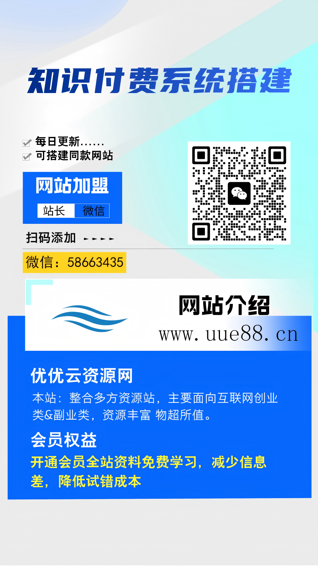 加盟优优云网创,加盟搭建同款知识付费资源网站,实现长期稳定被动收入~